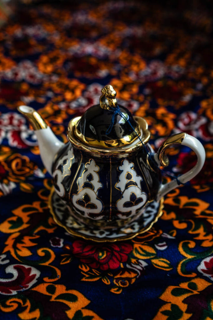 Située dans la vallée de Ferghana, Margilan fut autrefois un centre prospère de production de soie. Réputée pour ses tissus ikats colorés, elle prospérait au cœur de la Route de la Soie. Pourtant, ce passé glorieux semble aujourd’hui bien lointain. L’artisanat traditionnel, en déclin, peine à exister au sein de la ville. Pour le découvrir, il faut fouiller, chercher, presque s’égarer. C’est sur internet que l’on trouve l’adresse d’un des derniers ateliers encore en activité, survivant moins grâce à son savoir-faire que par l’attrait des touristes curieux de toucher du doigt un art en sursis.