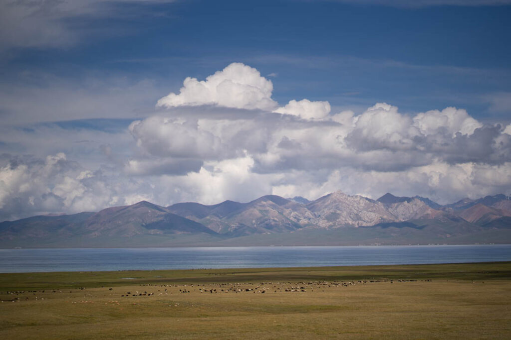 Le lendemain, nous longeons le lac à pied. Son immensité nous laisse figés. Les averses nous forcent à des haltes sous la tente. La météo transforme sans cesse le lieu, comme une géante aquarelle colorée par les nuages et le soleil. En chemin, nous croisons des Kirghizes à cheval, menant leurs troupeaux avec la sérénité de ceux qui appartiennent à ces terres. Nos vivres s’amenuisent : les amandes et le pain ont été engloutis trop vite. L’autostop devient une nécessité, mais la pluie nous retient pour une nuit supplémentaire.