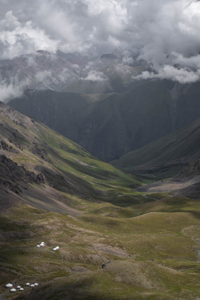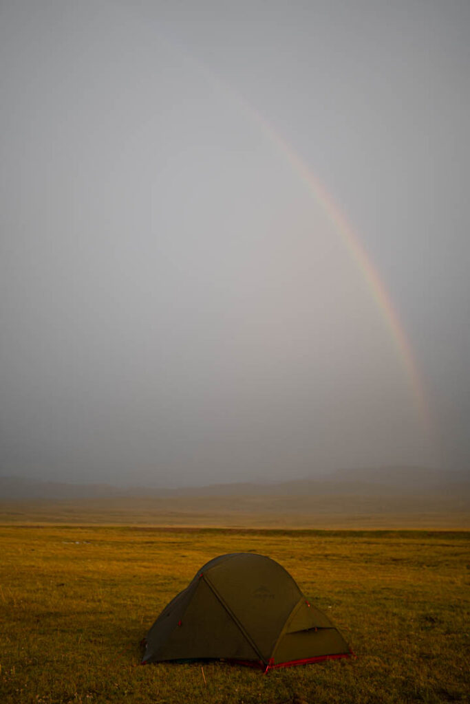 Plusieurs heures de marche nous ont finalement permis de rencontrer un groupe d’amis kirghizes dans leur voiture surchargée de vivres en direction de Son-Kul. Arrivés là-bas, le froid nous enveloppe. Le ciel s’alourdit, et nous installons la tente juste avant l’averse. Un arc-en-ciel s’étire au-dessus des chevaux errants avant que des éclairs viennent rythmer la nuit. Désormais habitués à l’orage, le tonnerre n’est plus aussi terrifiant.