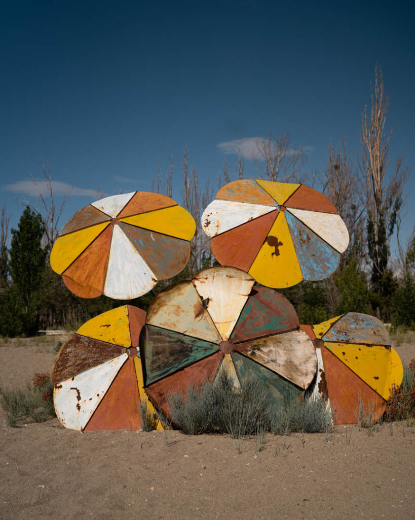 En route vers Issyk-Kul, Bahar nous embarque. Coach sportif, il fait un détour pour nous déposer à Balykchy. Il propose l’hôtel de sa sœur, mais nous préférons la plage. Il nous guide vers un recoin oublié des touristes. Vestiges soviétiques, parasols rouillés, lac immense. Bain de minuit sous une voûte étoilée. L’aube nous trouve de nouveau dans l’eau. Nous marchons vers la route, traversant un complexe touristique grouillant de vie. Les cris d’enfants russes s’éloignent.