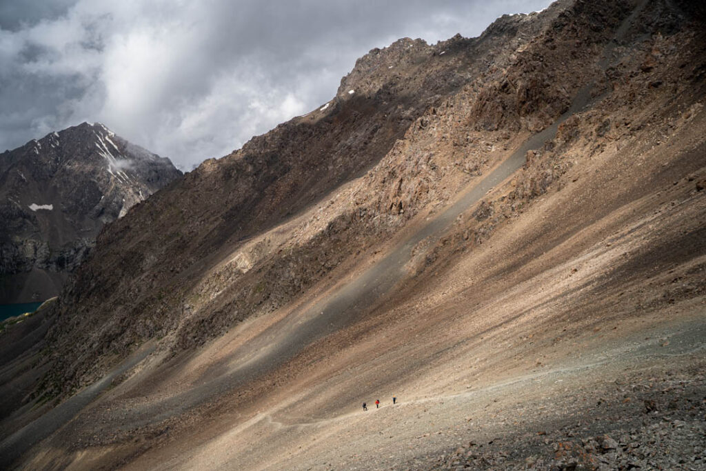 Le sentier devient raide, puis rocailleux, traître. Un faux pas, la chute est assurée. L’un de nous se retrouve bloqué, une escalade improvisée s’impose sur ce col devenu paroi. Chaque prise est cruciale. L’adrénaline pulse. Enfin, l’horizon se dévoile. Ala-Kul explose en couleurs, offrande après l’effort. Ala-Kul se mérite. Ses sentiers façonnent la patience, son ascension consume les muscles et attise l’attente. Puis, au dernier col, il surgit : un éclat turquoise serti entre les cimes. L’effort s’efface. Seule demeure la beauté, perchée à 3532 mètres d’altitude.